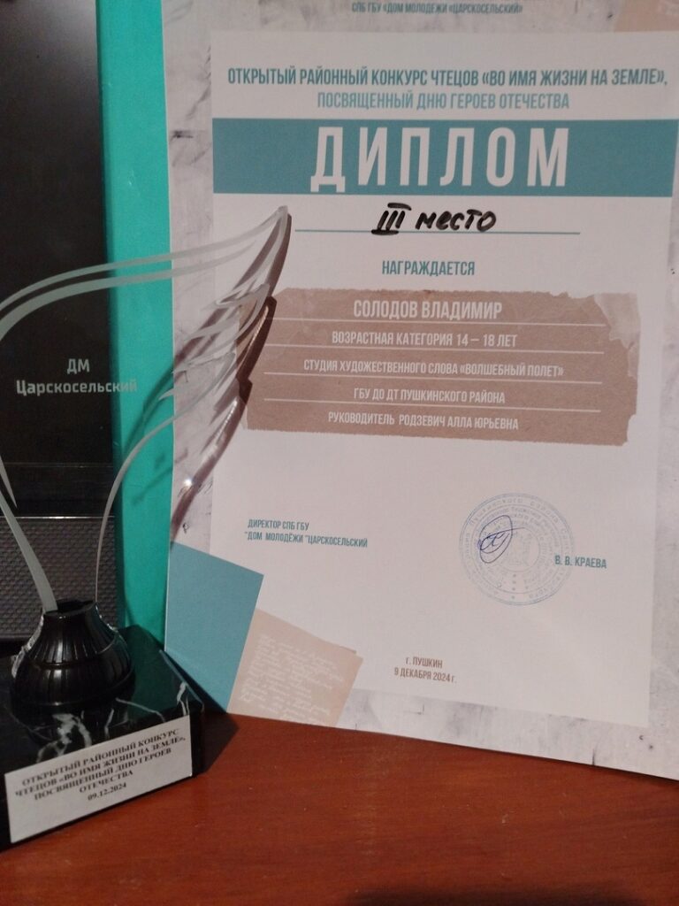 В Конкурсе в возрастной группе 14-18 лет принимали участие трое учащихся студии художественного слова «Волшебный полет» Дворца творчества Пушкинского района Санкт-Петербурга (руководитель — педагог дополнительного образования Алла Юрьевна Родзевич).В упорной борьбе ребята заняли призовые места и получили заслуженные награды за свой талант!