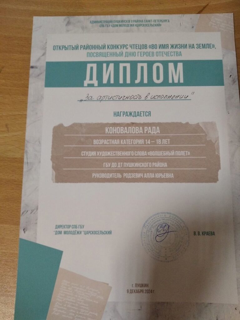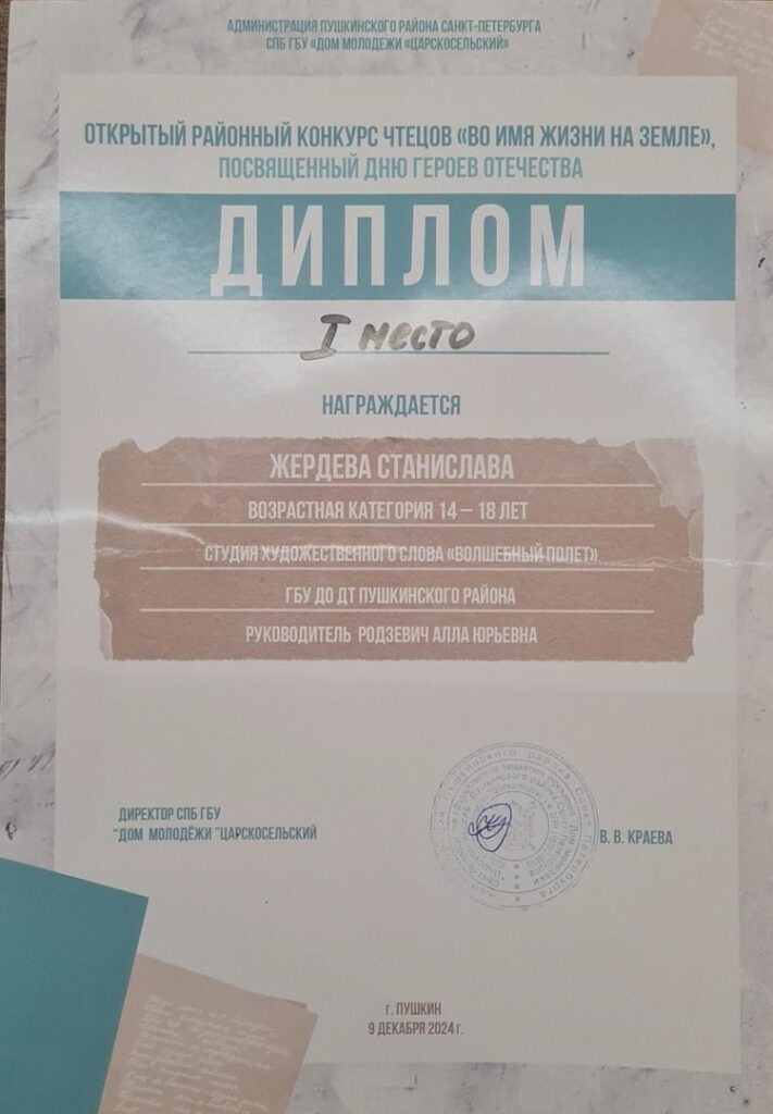 9 декабря 2024 года в Доме молодёжи «Царскосельский» состоялся открытый районный Конкурс чтецов «Во имя жизни на Земле», посвященный Дню героев Отечества в России.