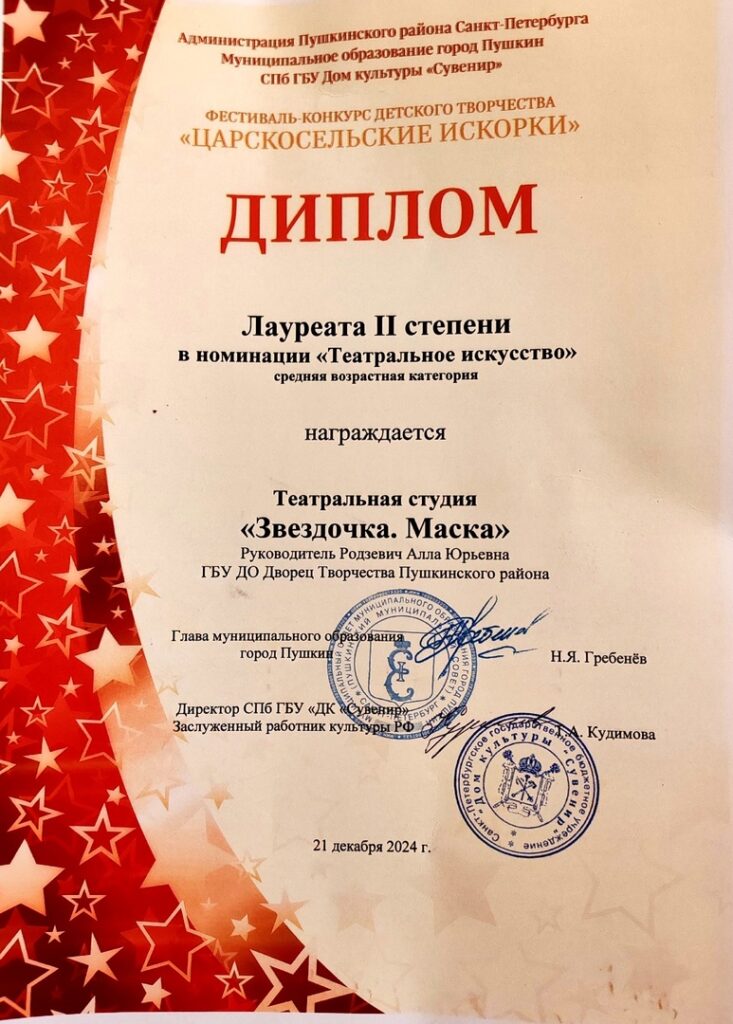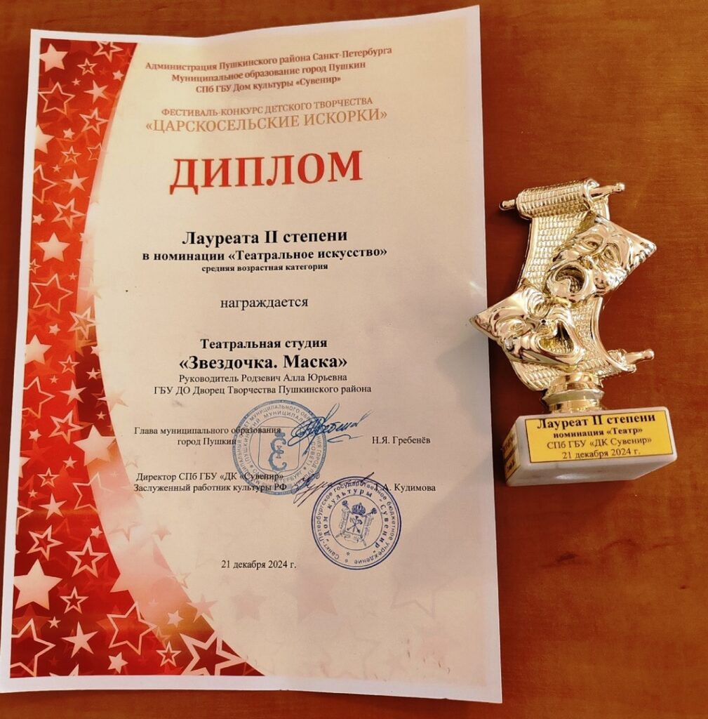 Поздравляем учащихся театральной студии «Звездочка. Маска» объединения «Театр-искусство коллективное»(педагог Родзевич А.Ю.), ставших лауреатами II степени в номинации «Театральное искусство» с номером «Вот так класс!».