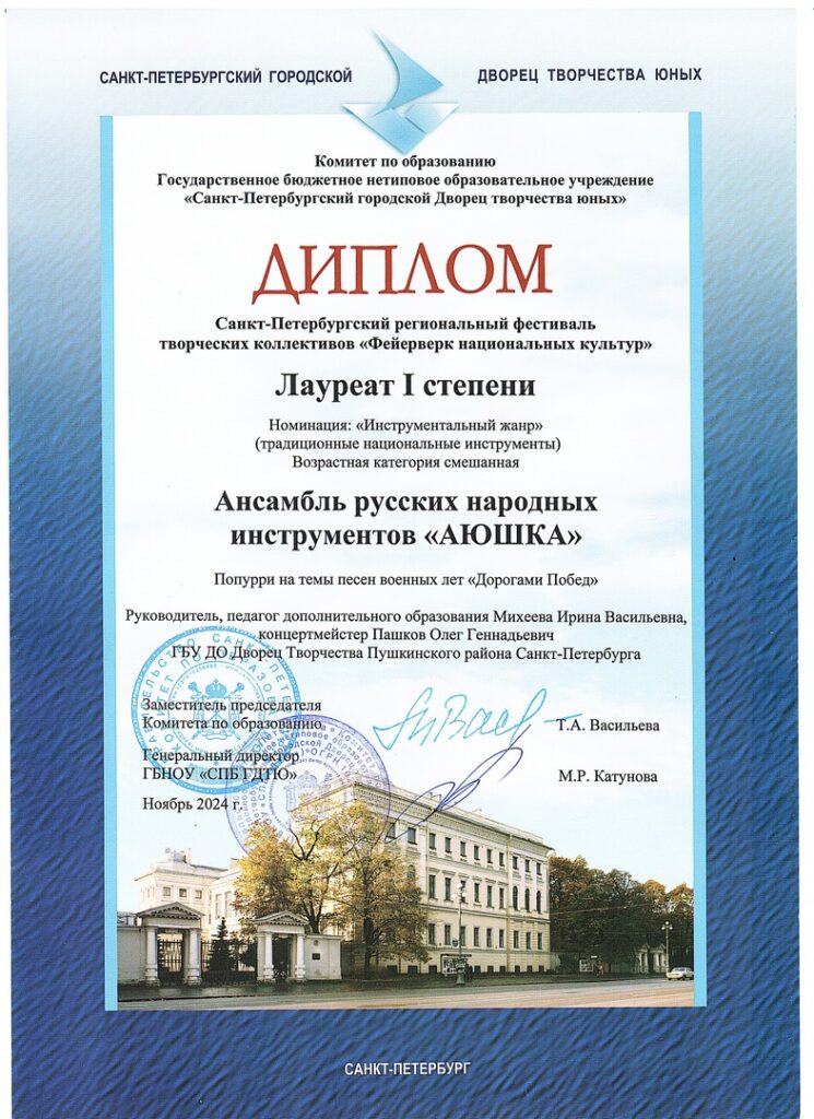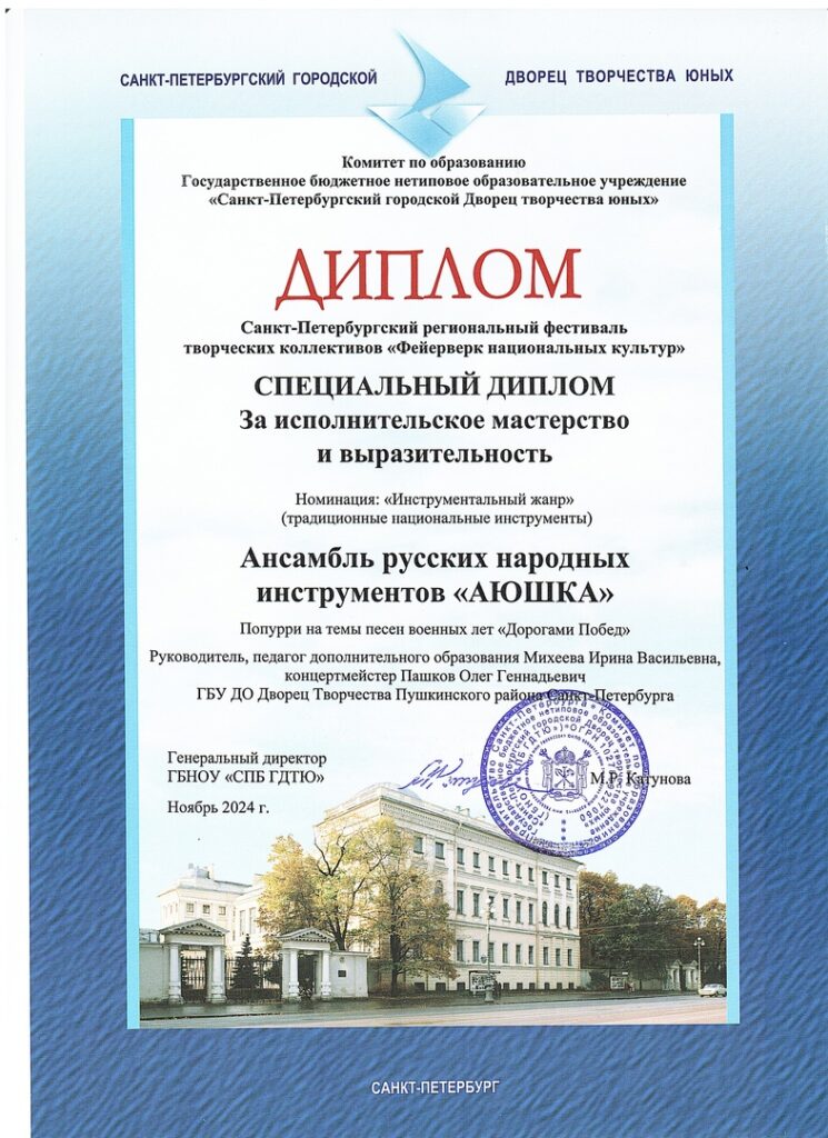 01 декабря 2024 года Ансамбль русских народных инструментов «АЮШКА», как Победитель Санкт-Петербургского регионального фестиваля творческих коллективов «Фейерверк национальных культур», участвовал в Гала-концерте фестиваля, проходившего в Концертном зале «Карнавал».