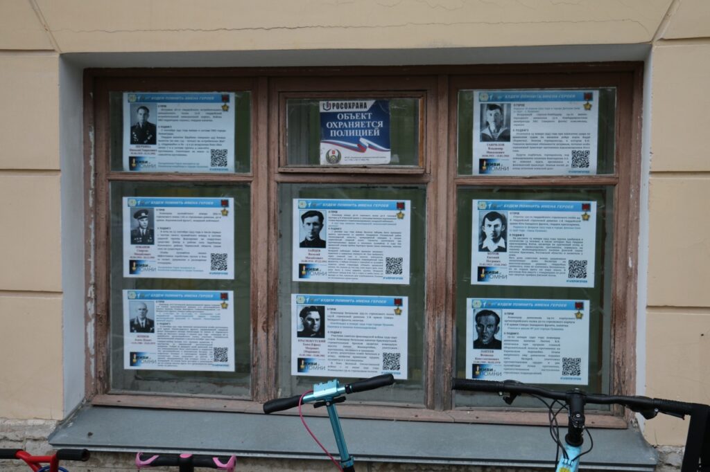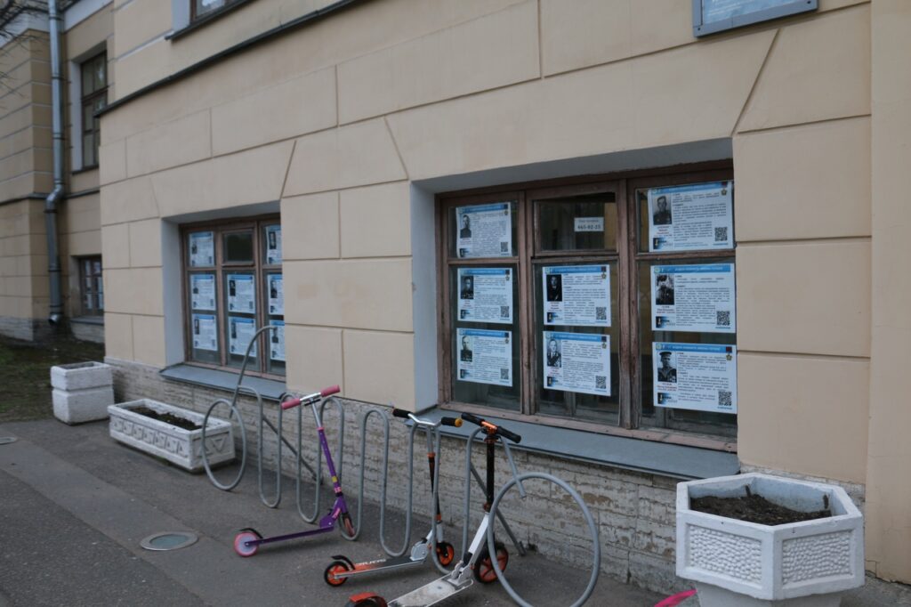Учащиеся традиционно разместили в окнах Дворца творчества Пушкинского района портреты и биографии жителей Пушкина, Героев Советского Союза, участвовавших в обороне Ленинграда, имена которых золотом выбиты на памятном знаке, что расположен на Октябрьском бульваре города Пушкина.