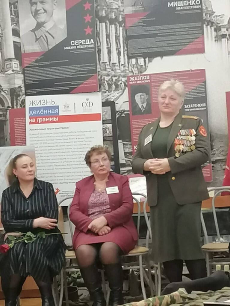 Руководитель музея школы №449 Шубелева М.Е. познакомила с историей музея «Память говорит», остановилась на экспозициях, посвященных антитеррористической операции в Чеченской республике, далее предоставила слово почетным гостям.