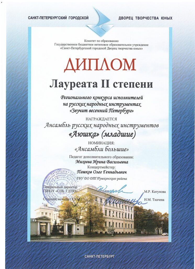 Ансамбль русских народных инструментов «АЮШКА» (руководители: Михеева И.В., Пашков О.Г.) достойно выступил на этом конкурсе и завоевал: