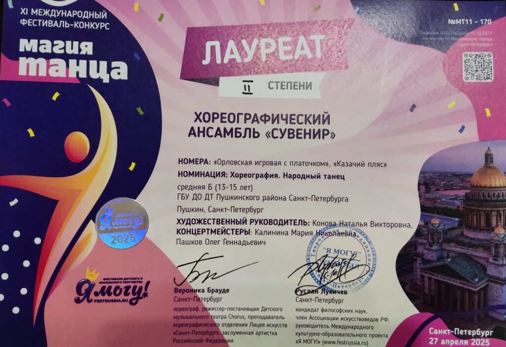 27 апреля 2025 года хореографический ансамбль «Сувенир» (руководитель — педагог дополнительного образования Конова Наталья Викторовна) принял участие в Xl Международном фестивале-конкурсе «Магия танца», который прошел на сцене Культурно-досугового центра «Московский».