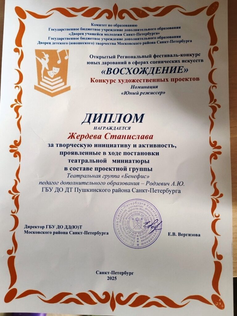 - В номинации «Соло-исполнитель в сфере театрального искусства» Станислава Жердева была награждена дипломом Победителя (3 место).