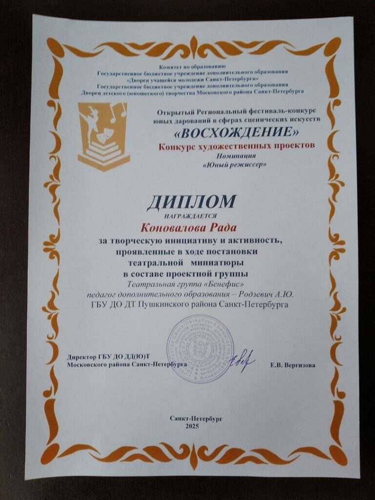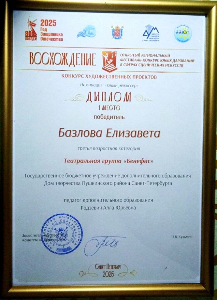- В номинации «Юный режиссер» конкурса художественных проектов Елизавета Базлова получила диплом Победителя (1 место).