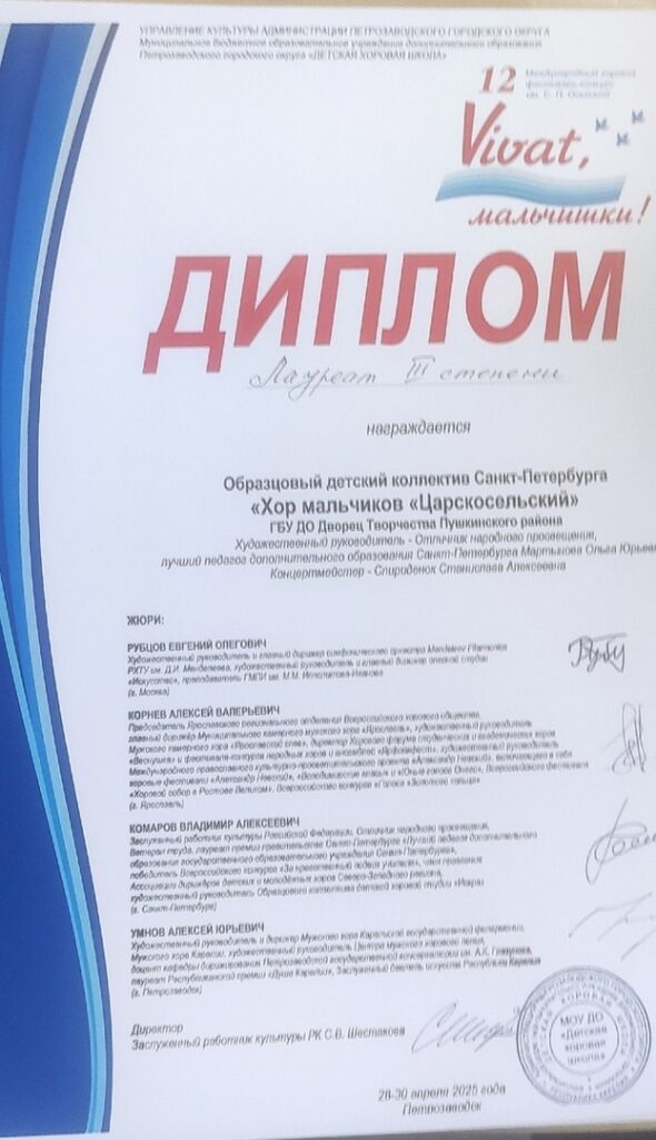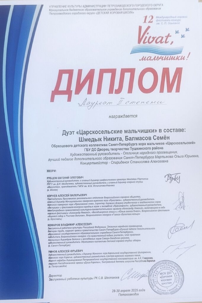 Поздравляем Хор мальчиков «Царскосельский» и Вокальный ансамбль «Царскосельские мальчишки» (руководитель — Мартынова О.Ю, концертмейстер — Спириденок С.А.) с победами на XII Международном хоровом фестивале-конкурсе им. С. П. Оськиной «Vivat, мальчишки!», который проходил с 28 по 30 апреля 2025 года в г. Петрозаводске.