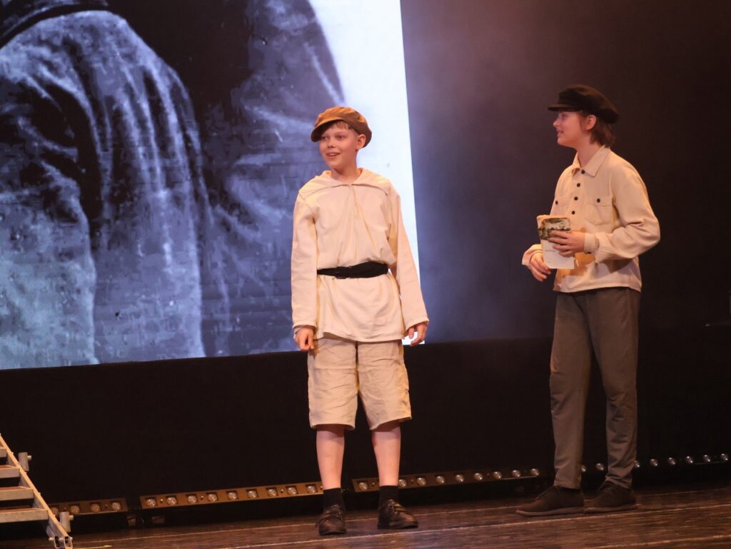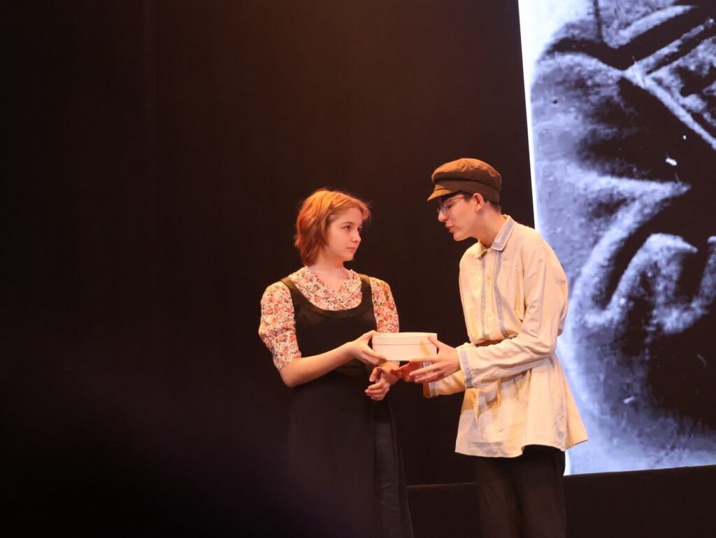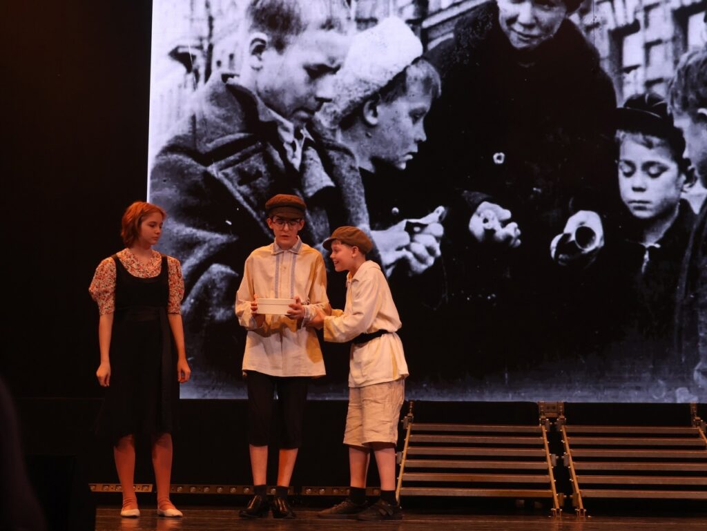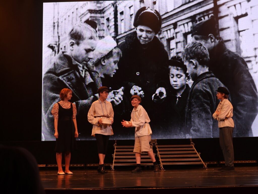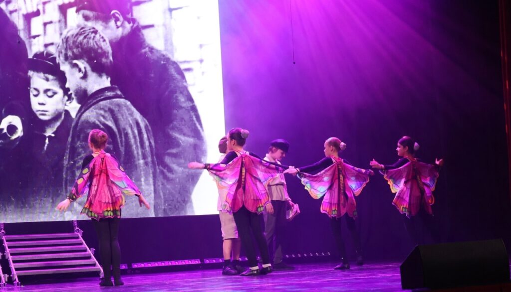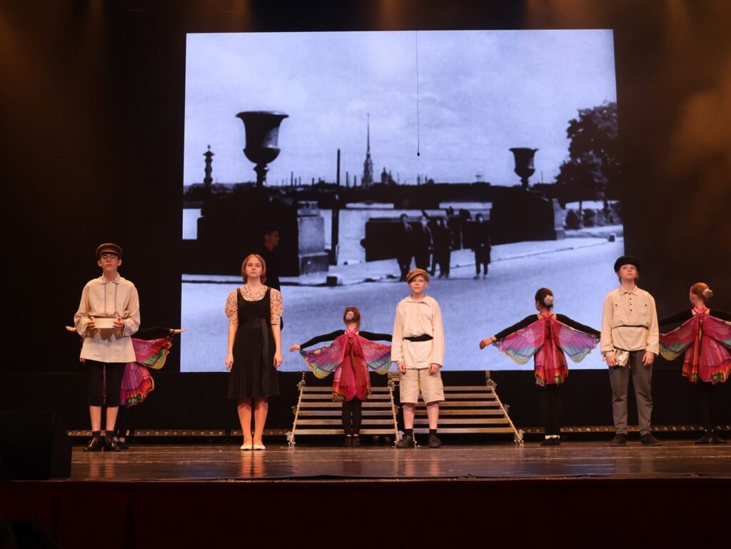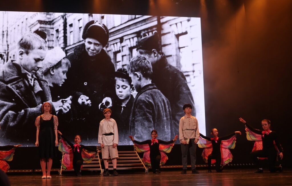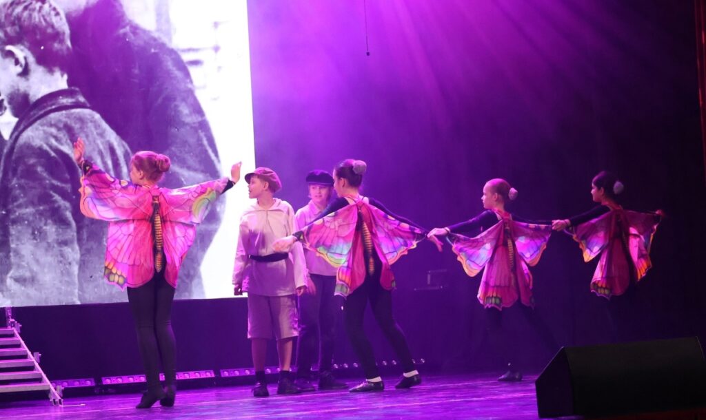 Учащиеся студий «Волшебный полет». «Бенефис» (руководитель Родзевич Алла Юрьевна) в творческом союзе с ансамблем народного танца «Царскосельские узоры» (педагог Петросян Карина Александровна) представили совместный творческий номер «Маленький шаг к Победе» об учащихся Дворца Пионеров в годы войны.