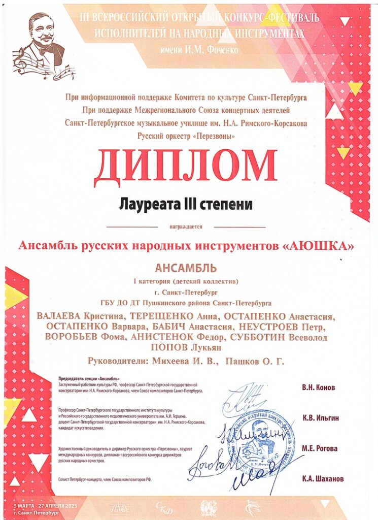 Ансамбль русских народных инструментов «Аюшка» Дворца творчества Пушкинского района Санкт-Петербурга (руководители — педагоги дополнительного образования Олег Геннадьевич Пашков и Ирина Васильевна Михеева) одержал победу. Ансамбль соревновался с музыкантами из музыкальных школ, что делает эту победу особенно значимой.