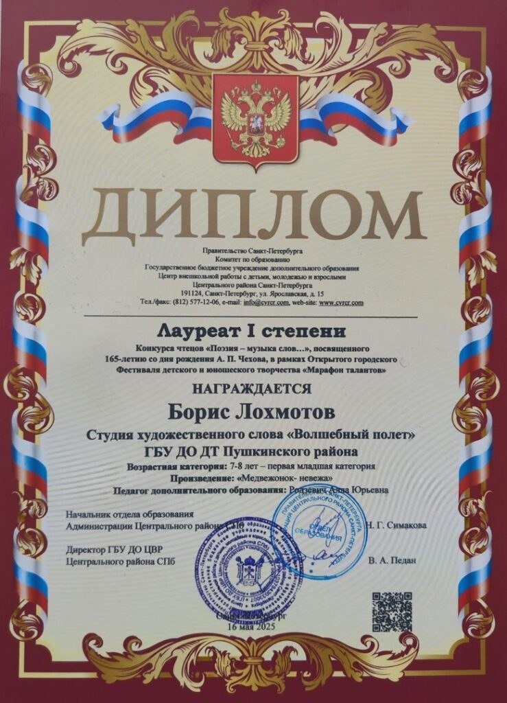 На Фестивале выступил Борис Лохмотов, обучающийся студии художественного слова «Волшебный полет» (педагог Родзевич А.Ю.), ставший обладателем Кубка фестиваля и Лауреатом I степени в младшей возрастной категории.