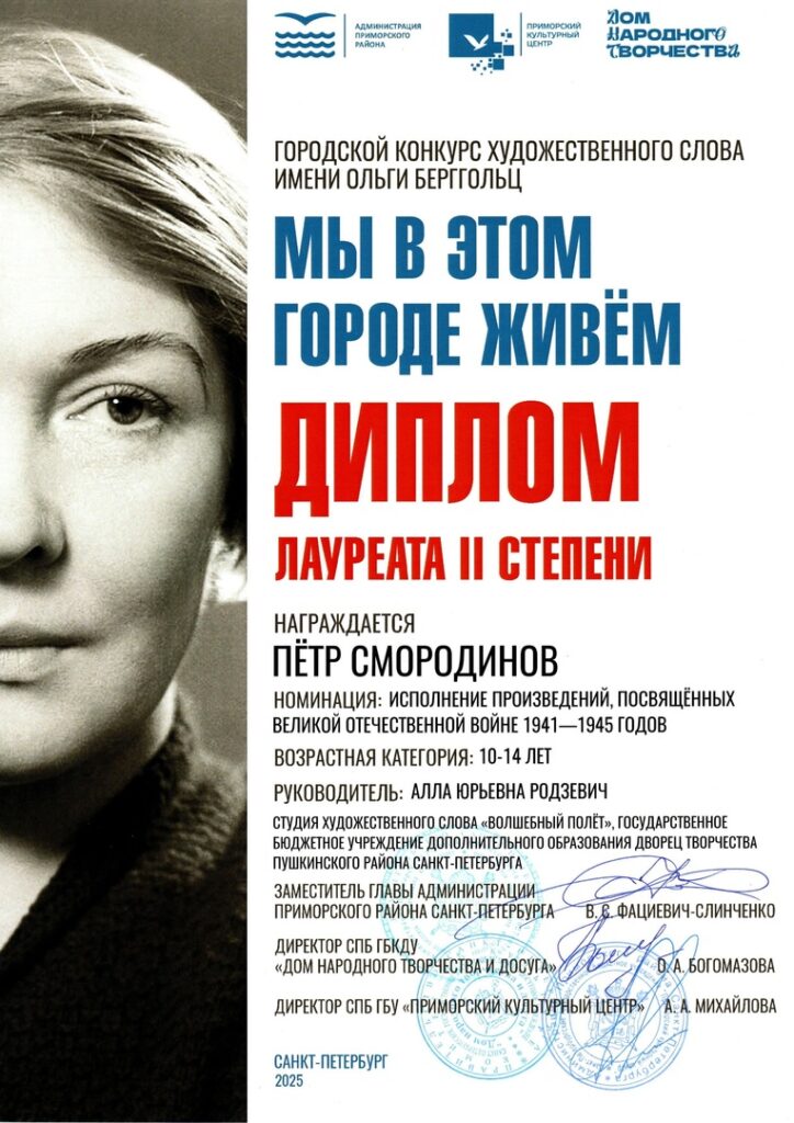 16 мая в сквере им. О.Ф. Берггольц состоялся Гала-концерт с награждением победителей и призеров XIII Городского Конкурсa «Мы в этом городе живём» им. О.Берггольц.